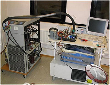 Испарительные холодильники широко применяются в быту и промышленности, но для охлаждения процессоров их применяют только экстремалы. Самодельное устройство собрано из двух холодильников. Первый каскад, использующий хладагент с индексом R404, снижает температуру -40°С. На второй стадии используется низкотемпературный хладагент R23, понижающий температуру уже до -100°C. Испаритель первой стадии охлаждает холодильник второй стадии, что позволяет использовать хладагент с очень низкой температурой кипения. Как утверждает конструктор, с помощью своего кулера он смог разогнать процессор Pentium 4 с тактовой частотой 3 ГГц до 4,4 ГГц, а процессор AMD Athlon 64 c частотой 2 ГГц - до 3,049 ГГц
