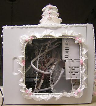 Так как он увлекается моддингом, то решил сделать "свадебный" корпус для компьютера своей невесты, заодно подарив ей более мощную машину, которая была ей необходима. Жених подошел к делу со всей ответственностью и фантазией: вырезал окно в корпусе, через стекло которого можно видеть фигурки молодоженов, обернул провода белыми лентами и даже соорудил сверху бутафорский свадебный пирог, в который положил кольцо